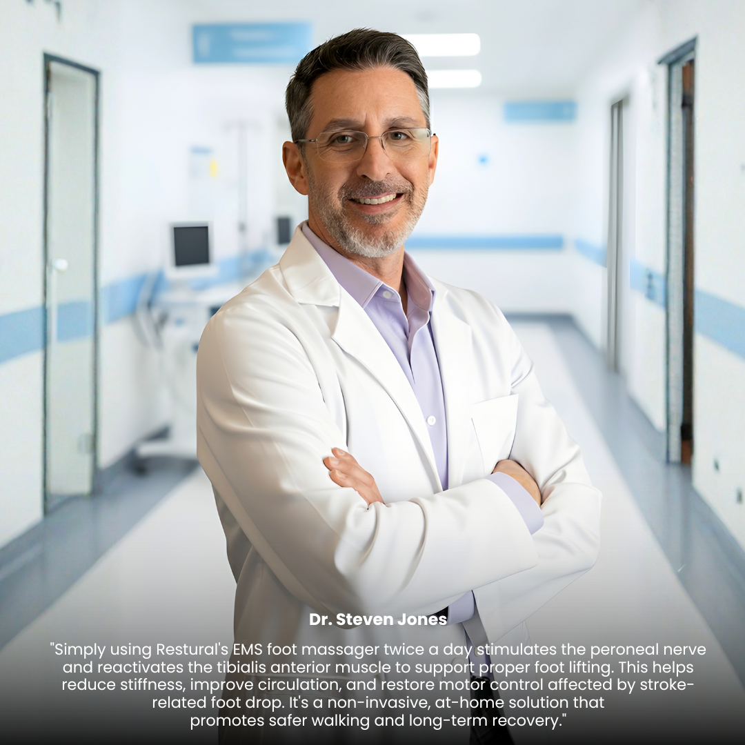 Restural uses gentle EMS pulses to wake up the muscles and nerves that lift your foot. It strengthens the weak areas caused by stroke so you can walk better — all without braces, pills, or painful treatments.