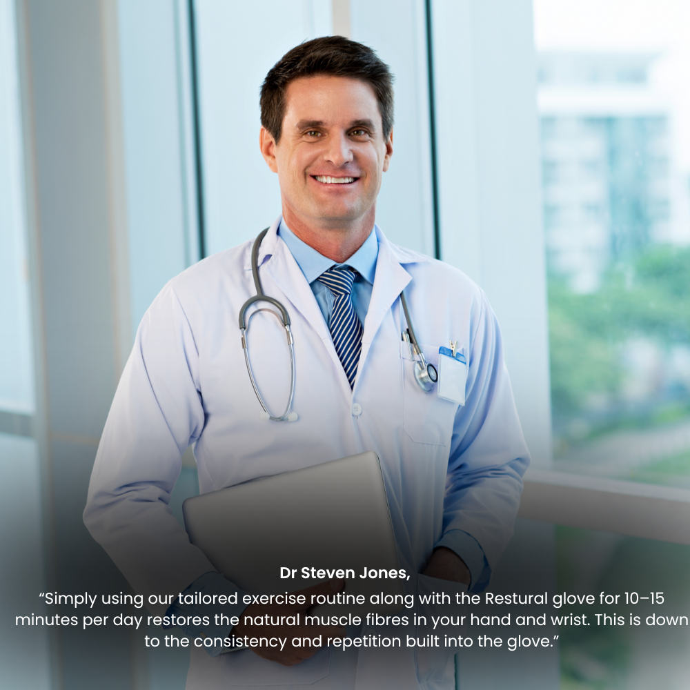 Restural uses natural & consistent movements to rebuild the core muscle fibres in your hand & fingers. In doing so our glove allows you to naturally rebuild your strength over time without needing steroid injections, surgeries or any form of pills.
